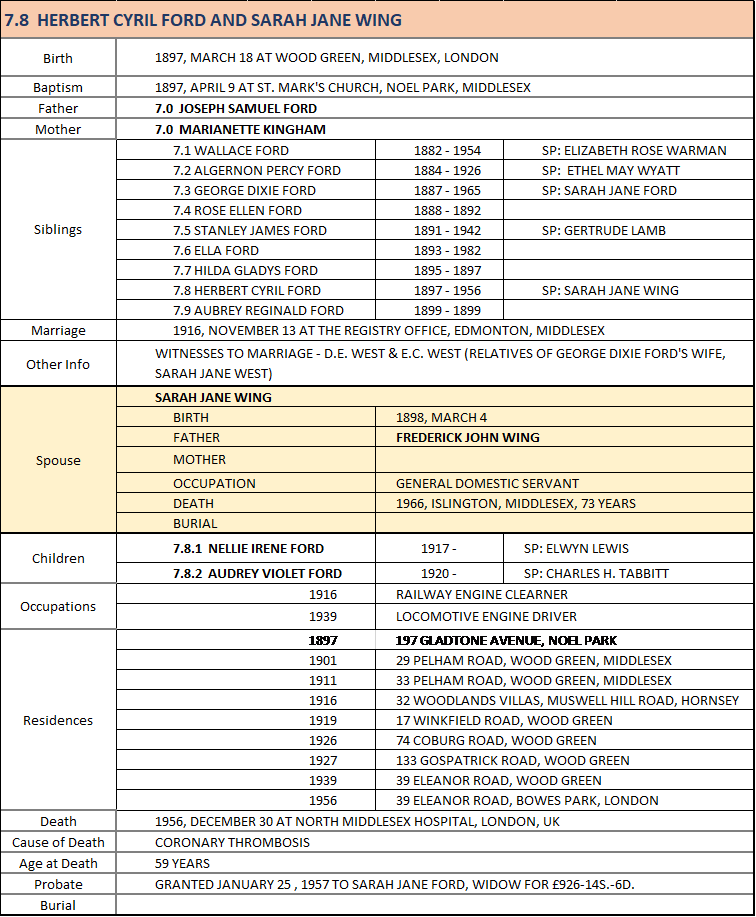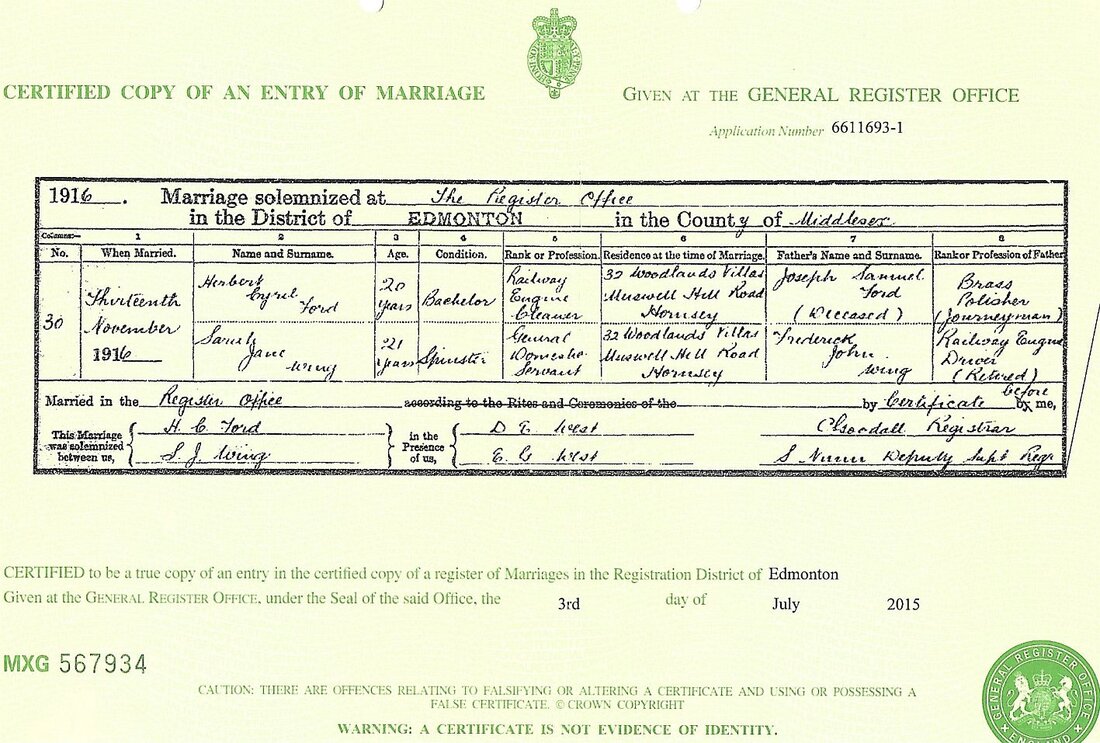 At the Registry Office in Edmonton, Middlesex on November 13, 1916, Herbert Cyril Ford, 20 years old and a bachelor, married Sarah Jane Wing, 21 years old, spinster. Herbert gave his profession as Railway Engine Cleaner and Sarah as General Domestic Servant. Both gave their address at the time of their marriage as 32 Woodlands Villas, Muswell Hill Road, Hornsey.