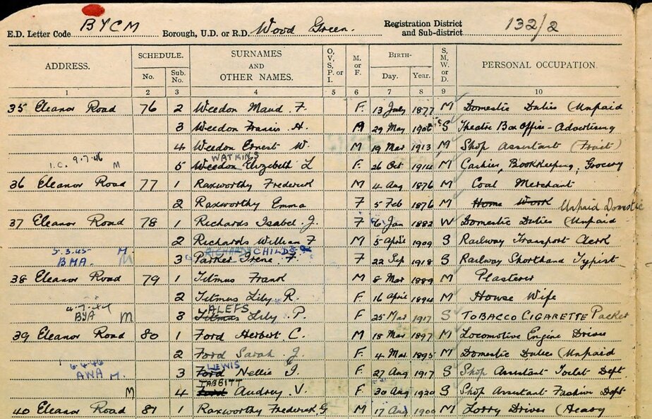 According to the Census of 1939, Herbert Cyril Ford and his family lived at 39 Eleanor Road, Wood Green. Herbert’s date of birth was listed as March 18, 1897, and he worked as a Locomotive Engine Driver. His wife, Sarah Jane Ford’s date of birth was March 4, 1898, and she worked at home.