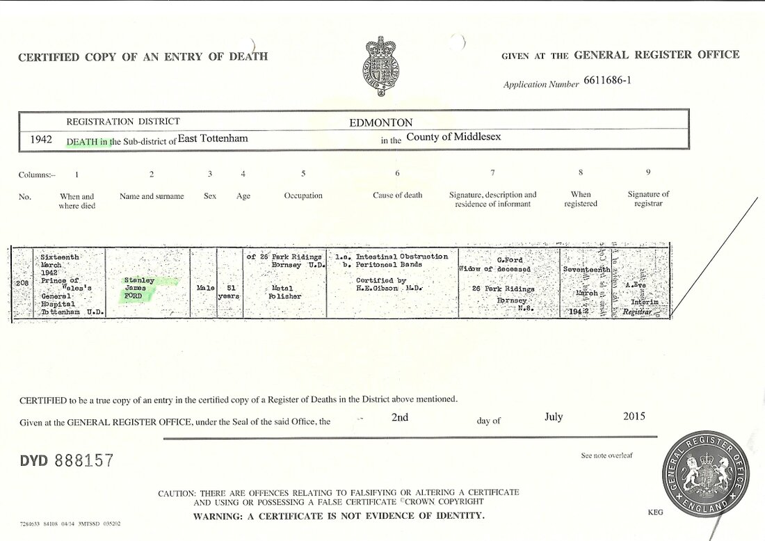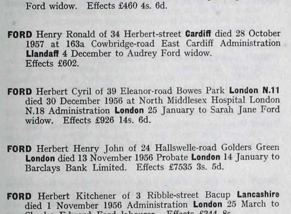 Herbert Cyril Ford of 39 Eleanor Road, Bowes Park died on December 30, 1956 at North Middlesex Hospital London.