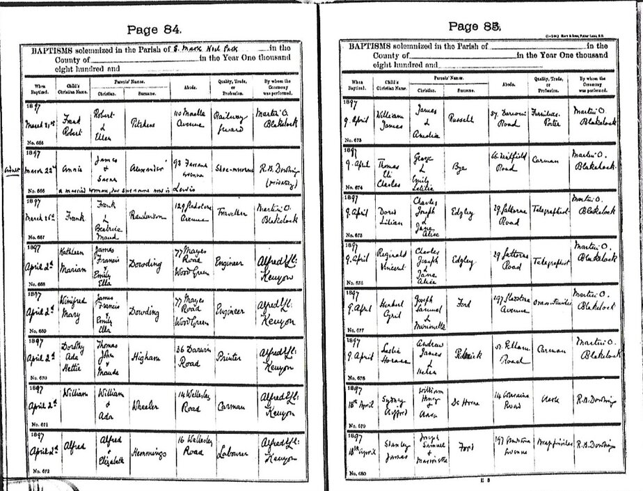 On April 9, 1897, the family trooped into the parish church of Saint Mark in Noel Park to have Herbert Cyril Ford baptised. They returned a few days later on April 18 to baptise two of their older children, Stanley James Ford and Ella Ford. The family’s address at that time was 197 Gladstone Avenue in Noel Park.