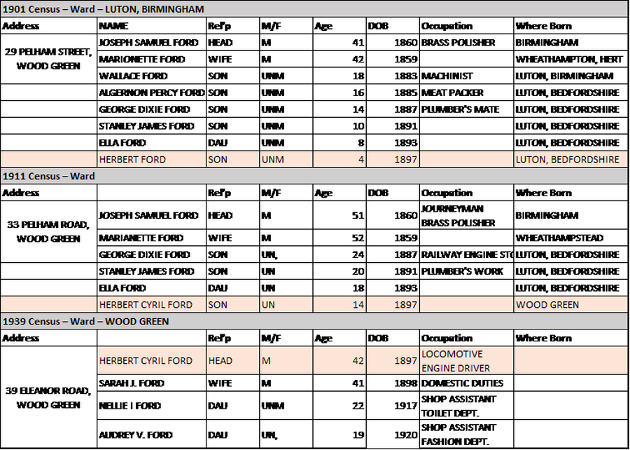 Name Relationship Age Marital Status Occupation Where BornJoseph Samuel Ford Head 51 Married Journeyman Brass Polisher – Plumbing Works BirminghamMarianette Ford Wife 52 WheathamsteadGeorge Dixie Ford Son 24 Single Railway Engine Stoker, Railways Luton, BedfordshireStanley James Ford Son 20 Single Brass Polisher, Plumbing Works Luton, BedfordshireElla Ford Daughter 18 Single Servant (daily) Luton, BedfordshireHerbert Ford Son 14 Wood Green, London