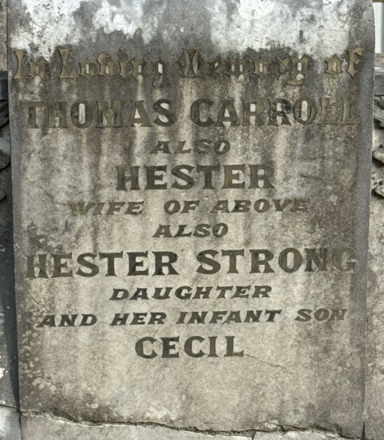 Born 1868, February 6 in TasmaniaFather Thomas CarrollMother Hester HouseMarriage 1886, November 27 at Launceston, TasmaniaSpouse Thomas John StrongDeath 1920, November 30 at Wynyard, TasmaniaAge at Death 52 yearsBurial Jenner Street Old General Cemetery, Wynyard, TasmaniaChildren 1. Hester Strong