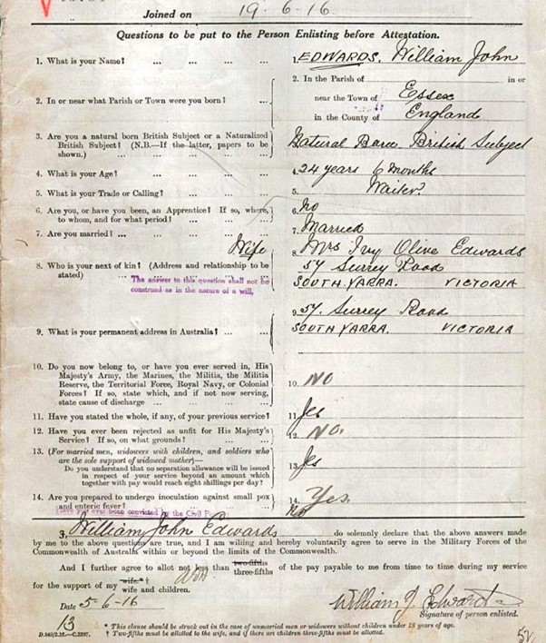 World War 1 started and life many other young men, William John Edwards enlisted. He signed up for duty on June 5, 1916. He became No. 2858 Private Edwards of the 2nd Pioneer Brigade of the Australian Imperial Forces. His enlistment document showed his date and place of birth and gave his occupation as waiter / cook. He lived at 57 Surrey Road, South Yarra with his wife Ivy and their two children – Agnes (aka Sally) and Merva.