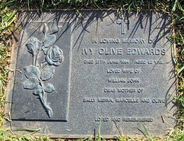 Name: Ivy Olive EdwardsBirth Date: 1892Death Date: 27 Jun 1984Cemetery: Springvale Botanical CemeteryBurial or Cremation Place: Springvale, Greater Dandenong City, Victoria, AustraliaSpouse: William John EdwardsAncestry.com. Australia and New Zealand, Find A Grave Index, 1800s-Current