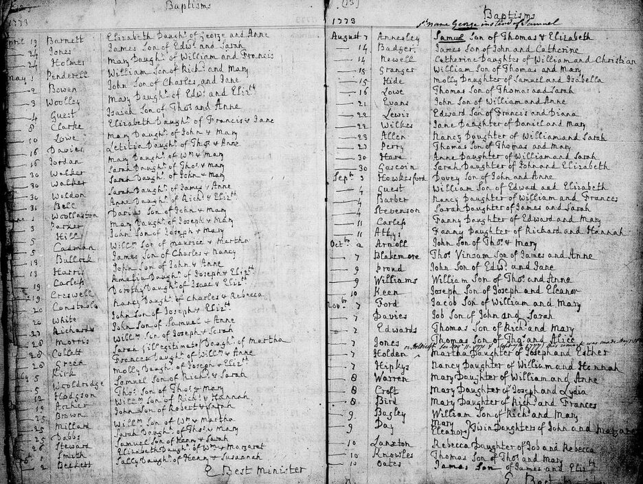 1773 – Baptism – Jacob FordOn November 7 at St. Leonard’s Church in Bilston, Staffordshire, Jacob Ford, son of William and Mary was baptised.