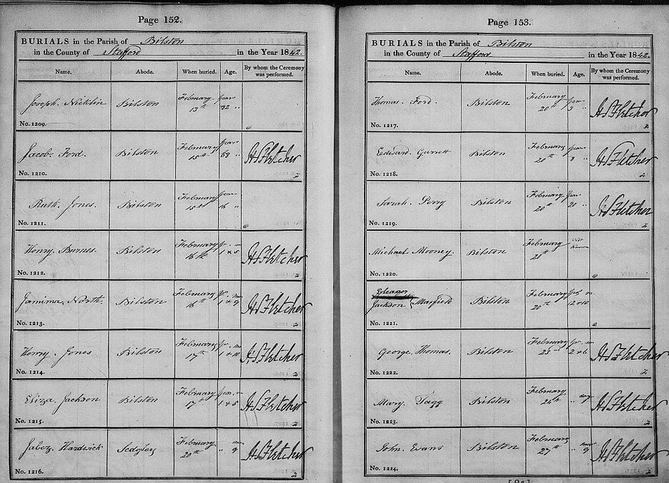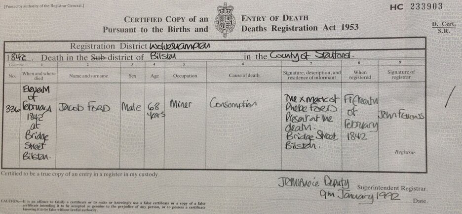 Jacob Ford (C1773) died on February 11, 1842 at his home in Bridge Street, Bilston.