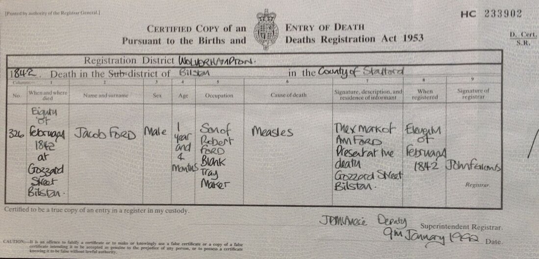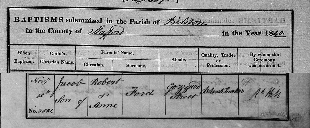 1840 - BaptismName Jacob FordBorn C1840 at Bilston, StaffordshireBaptism 1840, November 15 at Bilston, StaffordshireDeath 1842, February 8 at Gozzard Street, Bilston, StaffordshireAge at Death 1 year & 4 monthsCause of Death MeaslesBurial 1842, February at St Leonard's Church , Bilston, Staffordshire