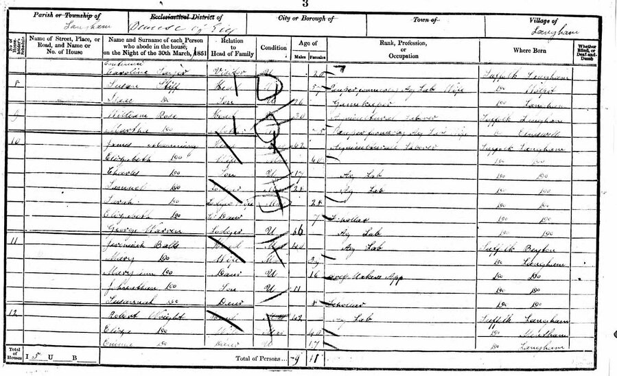 Now living at No. 9 Hill Watering Road in Langham, James is 71 and still working as an agricultural labourer. His wife, Elizabeth is 70 years old. His grand-daughter, Charlotte Ward aged 8 years, and his son, Samuel, aged 37 with his wife, Sarah, aged 37 years. And his youngest daughter, Elizabeth, 17 years old who is a dressmaker.