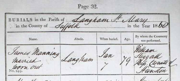 James Manning died January 7, in 1868 in Langham. Suffolk. The death register notes that he was "worn out".