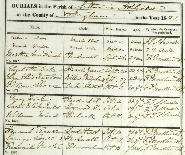 1881 - Burial Record for Hannah Turner, nee Stanley