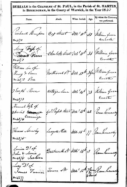 Last entry on the page - Abode Tower Street, Birmingham, Buried October 15, aged 7 years and 6 months