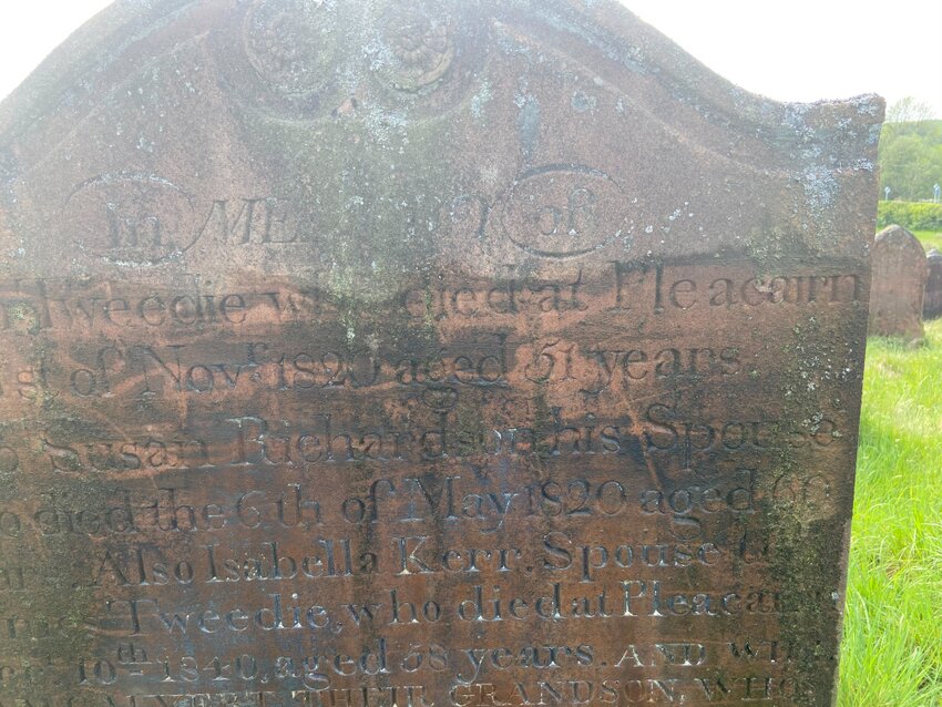 In memory of John Tweedie, who died at Pleacairn, 1st Nov 1820, age 51 yearsAlso Susan Richardson, his spouse, who died 6th May 1820, aged 60 years.Also Isabella Kerr, Spouse to James Tweedie, who died at Pleacairn, 10 Dec 1840, age 58 yrs.And William Calvert, their grandson, who died 28th June 1855 age 5yrs 8 mos.Also Susan, daughter of the above James Tweedie, who died at Kells, Southwick, 9th Feb 1860, age 37 yrsAlso the above James Tweedie, who died on the 1st Dec 1876, age 82 yrs.Also Margaret Nicholson who died at Milton Mill, Dunscore 3rd Jan 1888 aged 82 years