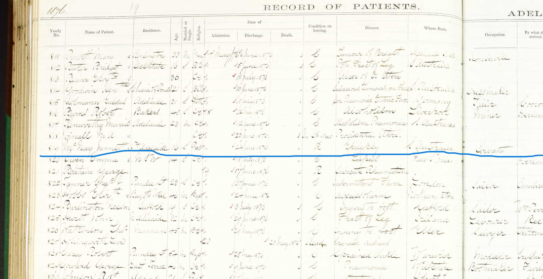 Janet was admitted to the hospital at least one other time when the admission report lists her relatives as her step-father, David Chamberlain whose whereabouts were unknown at the time and her sister, Agnes, Mrs. Charles James Warren. Charles was a baker in Houghton at the time. Also listed was her brother, John McNay of North Adelaide. Her religion was noted as Protestant.
