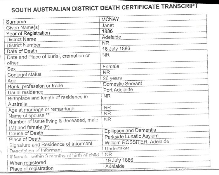 Janet McNayBorn 1861, February 22 at Oakbank, SAFather UnknownDeath 1886, July 16 at Adelaide Parkside Lunatic Asylum, in SAAge at Death 25 yearsCause of Death Epilepsy and Dementia