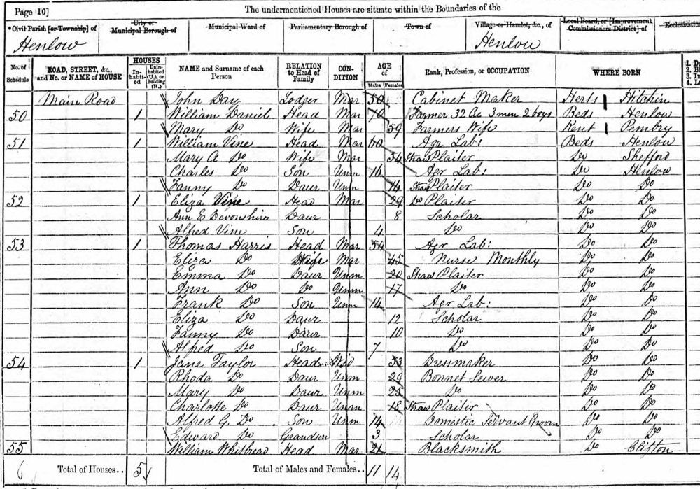 On the night of April 2, 1871 when the census was taken, Anne E. Devonshire, the 8 year old daughter of Eliza Vine, a school child, was living at 52 Main Road, Henlow with her mother Eliza, who was working as a straw plaiter, and her 4 year old brother, Alfred Vine.