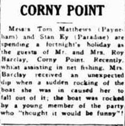 ARRIVED IN STATE 100 YEARS AGOOn 8th January, 1955, the Rumbelow family, of Yilki, Encounter Bay, will celebrate the centenary of the arrival in this district of Malin Rumbelow and his family in 1855. A large family re-union is expected to take place on the above date when a thanksgiving service will be held in the old homestead at Yilki, and later in the day a re-union picnic will be held on the beach in the vicinity of the Bluff. Celebrations will conclude with an open-air concert at night.Malin Rumbelow, Snr. his wife, and nine children left their home in Bury near Middenhall, Suffolkshire, England, in 1854, aboard the barque "Pestongee Bomangee." They arrived at Port Adelaide on October 7th, where they stayed for three months. In early January, 1855, their daughter Alice, married a sailor, Cain Jelliff by name, and the whole party including the newly-weds, set out per bullock dray for the whaling settlement of Encounter Bay, being persuaded in this venture by a Mr. Mark Last, a cousin, and friend of the family.This trip took a fortnight, and in those days was a hazardous journey, many wild blacks roamed the area covered, and roads were mere bush tracks, or non-existent. Considerable hard-ship was therefore experienced by the little party before they reached their destination. The family consisted of six daughters and three sons. The daughters, several of whom married twice, were Alice, married to Mr. Cain Jelliff, who later was drowned whilst fishing near the Murray mouth; Mahalia, married Mr. Weymouth who was accidentally killed a few years later, she then married E. R. Bolger. She died a few years later, leaving children by both husbands.Mr. E. R. Bolger then married Alice, who by this time was a widow. Sarah married Mr. William Watson, Emma married Mr. Thomas Watson. Caroline married Mr. John Cake-bread, Sophia married Mr. W. Robinson. Of three sons, only Malin survived. Godfrey and David died at early ages and were buried in the old churchyard cemetery in which the Rev. Ridgeway Newland's chapel known as the Tabernacle stood.When the family arrived at Encounter Bay they found the whaling industry well established, and Malin Rumbelow, Senior., found employment for a time in the store shed of the Whaling Company and helped in the cutting up of the last of these monsters of the deep caught by this company at Encounter Bay. It is of interest to note that when whaling was abandoned in these regions, one piece of equipment came into the hands of the Rumbelow family. This was a whaling gun which fired an explosive lance into the whale. This gun was later presented to the S.A. Museum.Eight years after the Rumbelow family arrived in South Australia young Malin, then a youth of 16 years of age, joined his brother-in-law, Mr. Cain Jelliff, in a fishing partnership at Encounter Bay. The young man proved an apt pupil, and a boat-man by nature. In those days fish were plentiful, also crayfish. Mrs. Cain Jelliff (Alice) helped the two partners by doing much of the selling of the fish, hawking it in the metropolitan area. Young Malin soon decided to marry and took unto himself a wife, a daughter of a local farmer, Mary Glassenbury, who was born at Hope Valley, S.A. From this happy union nine children were born (five boys and four girls) — William Henry, Malin, Godfrey, Cain, and Samuel. The latter died at the early age of five years. The girls were Alice, who remained single; Rose (Mrs. John Strawbridge; Jane, who married Joshua Tugwell; and Grace (Mrs. David Buck).Some years after the commencement of the partnership, Cain Jelliff was lost overboard from his boat, and was drowned. He was later picked up on the Coorong not far from the Murray Mouth. The fishing business was continued by Malin, and later became known as M. Rumbelow and Sons. Young Godfrey Rumbelow replaced his Aunt Alice, selling and hawking the fish, carrying much of it through the city with horses and van. When the railway commenced, the fish was sent through to E. Daw's Central fish market.Godfrey found the sea and fishing not to his liking, and for many years carried on a dairy and milk-round in the locality and Victor Harbour. Henry, Malin Jnr. and Cain proved first-class fishermen and skilful boatmen. Malin was an exceptionally fine boatman, and often skippered the cutter Ferret to victory at the Victor Harbour New Year's Day Sports, where a fishing boat sailing race was an annual event. The Rumbelow father and sons were of a jovial and friendly disposition and became popular with visitors and tourists and were largely responsible for the beginning of the tourist trade which now flourishes at Victor Harbour and the locality.Henry and Cain became renowned fishermen in the South. Henry had to his credit, 2 record hauls of mullet. 250 doz. at one time, and 300 doz. at another time. The partners owned several very fine fishing cutters, the best-known being the Rambler, and the Ferret. The Rambler made many fishing trips to Kangaroo Island and many exciting and adventurous excursions were undertaken in this boat. The Rambler is still fishing in South Australian waters under different owners. The Ferret, after many years of useful service during which time she was twice rebuilt, featured in some very adventurous incidents, missions of mercy, and pleasure trips on the River Murray when skippered by Henry Rumbelow's son, Walter. She featured in one of the few tragedies which befell the family. While on a fishing trip along the coast on December 23rd, 1932, she was wrecked. Two sons of the original partners, Walter and David Rumbelow were drowned; Lionel Rumbelow, the other occupant at the time, had a marvellous escape from death, and still lives to take the silver harvest from the deep.In April 1905, (David) Malin Rumbelow, who was almost a giant in stature, and loved by everyone who knew him, was brought home dead, having suffered a heart seizure whilst on a fishing excursion with the Rambler. He left a widow, and eight children,