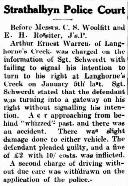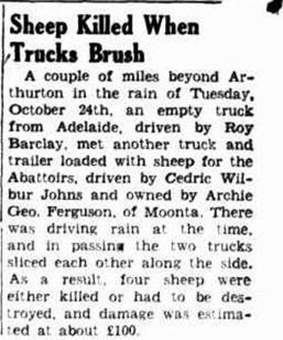 Cyclists CollideAt the Port Road, Kadina, on Sunday afternoon, February 13, a collision took place between a motor cycle ridden by Fergus Richard George Warren, of Stansbury, and a push bicycle ridden by Thomas Charles Inglis.Warren sustained cuts to the right knee and Inglis suffered severe shock.The motor cycle was slightly damaged and the front wheel of the cycle smashed.1938 - Transcript of Newspaper Report, "Kadina and Wallaroo Times (SA)" Wednesday 16 February 1938