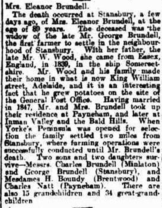 Her grandparents were George Brundell and Eleanor Wood. After their marriage they took up residence in what is now King William Street, Adelaide and grew potatoes on the site of the current Post Office. Once land was opened to settlement, they settled on a parcel of land two miles from Stansbury where they ran a sheep station. They had two sons and two daughters from their union, one of which was George Brundell, junior. George Brundell was one of the first two farmer settlers in the area.