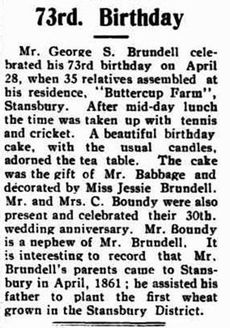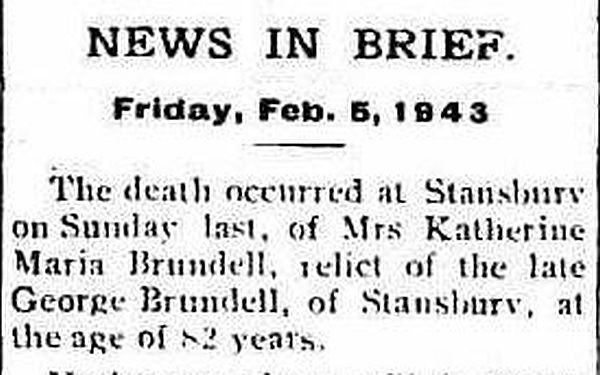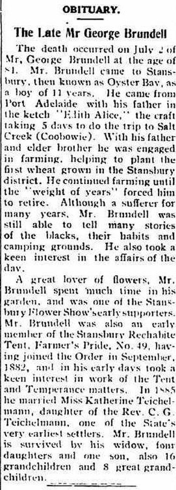 Born 1886, May 5 at Stansbury, SAFather George Brundell 1861 - 1941)Mother Katherine Maria Teichelmann (1860 - 1942)Paternal Grandfather George Brundell (1822 - 1893)Paternal Grandmother Hellen Grace Wood (1827 - 1916)Maternal Grandfather Christina Gottlobb TeichelmannMaternal Grandmother Margaret NicholsonDeath 1961, May 14 at Yorketown, SAAge at Death 75 yearsBurial Stansbury Cemetery, SASiblings