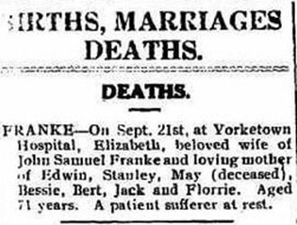 1946 – Elizabeth Franke, nee Hoile – Death (mother of Edwin John Franke