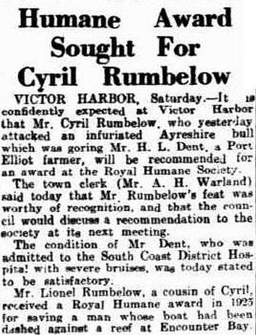 1934 – Cyril Vernon Rumbelow Bravery AwardATTACKED BY ANGRY BULL - Man Injured Near Victor HarbourWhile returning from Port Elliot on Friday, two employees of the Victor Harbour Electricity Company, Messrs Len Penalurick and Cyril Rumbelow, noticed a bull apparently on top of a man.Seizing an axe, Mr. Rumbelow rushed across a paddock and found Mr. H. L. Dent, a farmer, of Port Elliot, being attacked by an infuriated Ayrshire bull.Mr. Dent said that the bull had charged him while he was driving cows in the paddock, and he had hung on to the chain around his horns and held him in that position for at least a quarter of an hour before help arrived.Mr. Dent was taken to hospital suffering from shock.1934 - Transcript of Newspaper Report, "Chronicle (Adelaide)", February 15, 1934