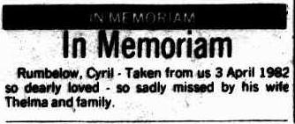1984 - In Memorium - Cyril Rumbelow, SA, “Victor Harbour Times (SA)” 4 April 1984