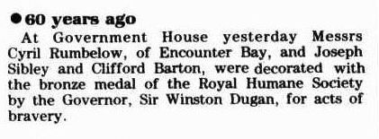 1934 – Cyril Vernon Rumbelow Bravery AwardACTS OF BRAVERY REWARDEDAt Government House yesterday Messrs. Cyril Rumbelow, of Encounter Bay, and Joseph Albeit Sibley and Clifford C G. Barton, of Port Elliott, were decorated with the bronze medal of the Royal Humane Society by the Governor, (Sir Winston Dugan) for acts of bravery.Rumbelow was severely bruised and cut when he went to the assistance of Mr. H L. Dent, who was being attacked by a bull in a paddock adjacent to Port Eliot.1934 Transcript of Newspaper Article, "Victor Harbour Times" September 14, 1934