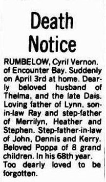 1984 – Cyril Rumbelow – In MemoryRUMBELOW, Cyril Vernon.Thelma and families wish to thank all relatives and friends for their kind thoughts, prayers and help, floral tributes and cards in the sad, sudden loss of their beloved husband, father, step-father, father-in-law, and poppa.Please accept this as our personal thanks. God bless you all.1982 - Death Notice, Cyril Rumbelow, "Victor Harbour Times (SA)" 21 April 19821982 - Cyril Rumbelow, Death, "Victor Harbour Times (SA)" 21 April 1982