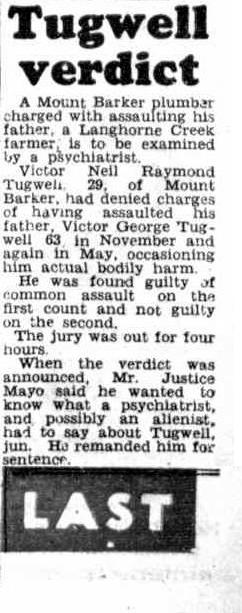 Ordered To Stay Away From FatherVictor Neil Raymond Tugwell, 29, plumber, of Mount Barker, was committed for trial last night on two charges alleging assault on his father, Victor George Tugwell, 63, farmer, of Langhorne's Creek. He was charged with having assaulted his father, occasioning actual bodily harm, at Langhorne's Creek on November 18 last year, and on May 4. Tugwell, jun., was allowed bail of £200, with two sureties of £50 each, a condition being that he keep away from his father until the case was settled.Tugwell, Senior. caused a stir in court yesterday morning when he refused to answer a question about a certain document by Mr: F. B. Moran, who appeared for the defendant. Told by counsel he could be held in contempt of court, Tugwell, Senior. still refused to answer the question, but after a 10-minute adjournment supplied the answer. Tugwell, Senior., who had spent five hours in the box on Thursday, remained on the stand under cross-examination by Mr. Moran for more than two hours yesterday. Seating accommodation in the body of the small courtroom was fully occupied.Denies Statement Continuing his evidence under cross-examination by Mr. Moran, Tugwell Senior. denied saying 'Where shall we go?' after leaving Langhorne's Creek on the Sunday.Mr. Moran— Was there any talk about going to Sydney?Tugwell - Not that I know of.Moran - Did your son, on Monday morning at Malpas, get some water and leave you with the man who towed you into the town?Tugwell - Yes, for a few seconds. He got the water and ran back with it.Moran - Did you tell this man about being abducted by your son?Tugwell - No.Witness said they had reached Renmark late on the Monday afternoon and had a meal together at a cafe. He did not remember asking a policeman the way to the billiard saloon. A man gave them directions. Tugwell Senior. said he and his son had played two games of billiards. He had not approached anyone in the billiard hall to tell them his son had abducted him, and after leaving the hall slept in his son's car. After a discussion of figures for several hours the following day, he and the defendant had returned to Renmark, where a new head gasket was bought, witness paying for it by cheque. He denied he had walked around Renmark while the gasket was being fitted.Stopped By Police About 30 miles beyond Mildura on Tuesday night a man in a utility had stopped them and said he wanted to get a message to Mildura as he had blown a big-end, witness added. On the outskirts of Mildura, they were stopped by a policeman. There had been an accident earlier, and his son had got out of the utility and spoken to the policeman on the road behind the vehicle.Mr. Moran — At the scene of the accident why didn't you get out of the buckboard and scream for help?Witness— I did not feel in a fit condition. Witness said his eyes were still blackened, but no one at Renmark had asked him how he got the shiners. About 34 miles before Balranald he and his son had another talk about their dispute. He denied telling his son he did not like fighting with him but admitted this might have been said later at Balranald. The defendant might have said he did hot like fighting as the witness was his only next-of-kin apart from his wife. He denied telling the defendant he would assist him with his next tractor instalment. They were on friendlier terms at this stage.Mr. Moran — Do you remember telling your son you had had papers typed transferring the farm to him?Witness— That is only part of it. One of the conditions was that the defendant should agree to the terms that were printed. He did not tell his son what the terms were.Mr. Moran— Was anything said about payments to you for the rest of your life being one of the conditions? —Tugwell - There may have been.'The Conditions' Witness said the papers had been destroyed and that he had told the defendant about the conditions 'to give him a chance to see what he would have got if he had done his work.' Asked by Mr. Moran who had typed the transfer papers, witness refused to answer. Inspector Bonython, by consent, intervened at this juncture and told the witness that unless he answered the question he could be imprisoned for contempt of court. Witness again refused to answer. Following an adjournment of the court for 10 minutes, witness returned to the box and told Mr. Moran that the papers had not been typed. 'I typed them in my mind,' he said.Mr. Moran — You said earlier that the agreement had been destroyed?Tugwell - I made it out in my mind. I destroyed the memory of it.Asked by Mr. Moran why he had told his son about the paper, witness said: 'To let him have an idea of what he had lost through not behaving himself. Witness said that on Thursday night when he and the defendant had stayed at an hotel at Booligal he had not complained to anyone there about his son taking him away or that his son had assaulted him.Mr. Moran— did someone from a Melbourne newspaper ring you on Thursday night?Tugwell - I do not know who it was.Police Search Witness denied telling his son after leaving the telephone that the police were searching for them or that the defendant had said: 'Surely the two of us can go for a holiday without everyone tracking us down.' A police sergeant had showed him a newspaper cutting and that had been the first indication he had had that the police were looking for him. The defendant might have known, because he was getting the newspapers.Mr. Moran — Did you ask Hay police to lay a charge against your son?Tugwell - No. At that stage witness was not prepared to forgive his son, but was prepared to discuss their dispute further with a Mr. Prest as mediator.Mr. Moran— If you had agreed to do that, you would not have wanted to see your son in trouble with the law, would you?Tugwell - Yes.Moran - Do you still want to see your son punished by the law?Tugwell - To a certain extent, that he keep the peace towards me or anyone with me.Police Sergeant John Schwart