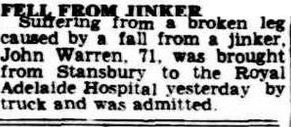 When John was 71 years old, he fell from a jinker, breaking his leg. He was bundled into a truck and taken to Adelaide Hospital from Stansbury.