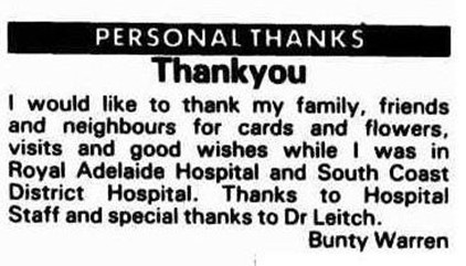 1987 – Thanks – Marie Clarice (Bunty) Warren