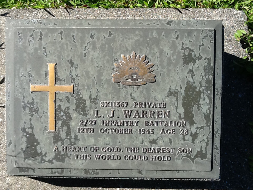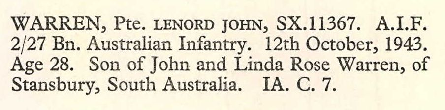 WARRENCherished memories of our dear brother and brother-in-law Lenord killed October 12. New Guinea.His duty nobly doneRemembered by Ferg. Bunty. Daisy and Cyril1948 - "Advertiser (Adelaide, SA)", 12 October 1948