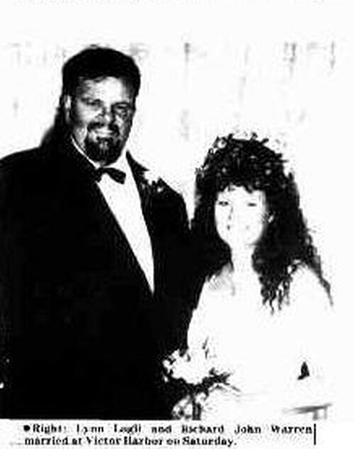 COUPLE WED AT VICTOR HARBOURLynn Logli and Richard John Warren were married before 90 guests by minister Milton Paull, at the Baptist Church, Victor Harbor, on Saturday.The bride, who wore an ivory, satin and lace handkerchief evening gown, was given away by her brother, Timothy Firth.She was attended by her daughter, Cinnamon Logli, flower girl, and son, Ian Logli, was ring bearer. The groom was attended by David Gubbins, best man, and groomsman Mark Potter.Making the day an extra special occasion was the groom’s parents, Ferg and Bunty Warren of Victor Harbor, who celebrated their 50th wedding anniversary and Ferg’s 77th birthday. The bride and groom will live in Port Elliot.Transcript of Newspaper Report, “Times (Victor Harbor, (SA)”, December 16, 1994