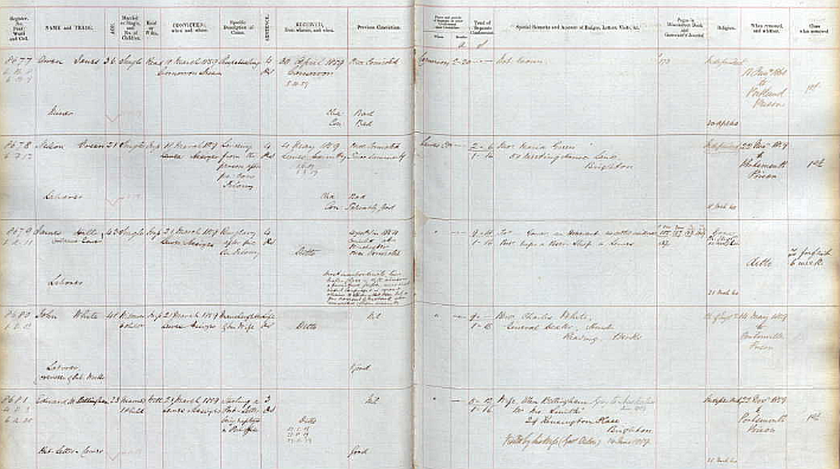 Edward Bellingham, aged 23 years, Married with 1 child, who could read and write well, was convicted on March 21 in 1859 at Lewes Assizes for stealing a post letter, being employed in a Post Office. He was sentenced to 3 years. He had no previous convictions and his behaviour was good, although a later report stated his behaviour as bad. His wife, Ellen Bellingham who had been living with her parents Mr. and Mrs. Smith at 29 Kensington Place in Brighton, visited her husband on June 14, 1859 and announced that she was going to Australia.