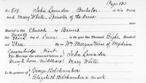 John LaunderBorn 1775Baptised 1775, August 13 in Speldhurst, Kent, UKMarried 1803, June 23 Groombridge, KentSpouse Mary White