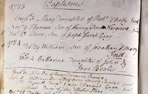1784 - Baptism Record Sarah Stagg, Daughter of John and Hester Stagg - September 26