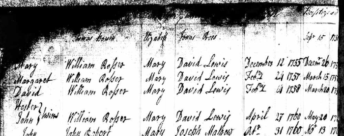1760 - Baptism Record for Hester Rosser (twin) and siblings, Mary, Margaret, David and twin, John