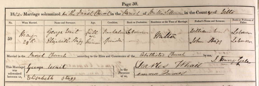 1851 - Marriage of Elizabeth Stagg, Daughter of John and Hester Stagg, to George Wait