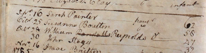1784 - Burial Register John Stagg, husband of Hester, father of Elizabeth and Sarah, October 30, aged 32 years