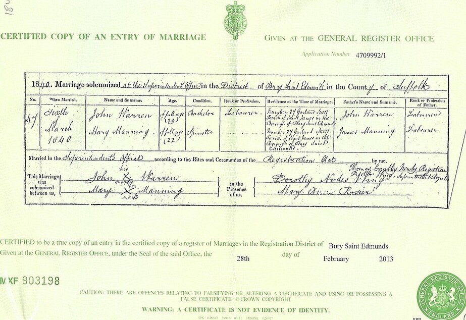 Mary Manning had an older sister named Elizabeth Manning. In my research, I came across a marriage between a John Warren and an Elizabeth Manning on September 24, 1830 at Langham, Suffolk.