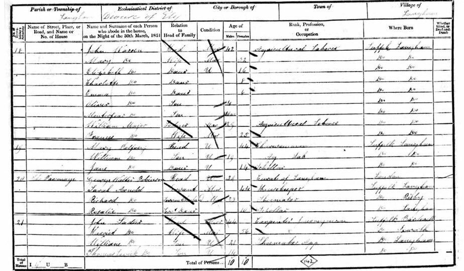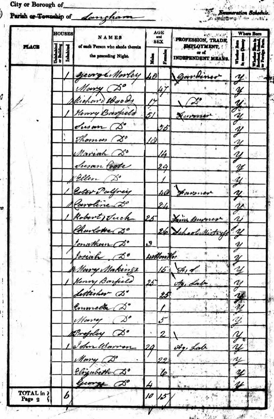 • John Warren, Head, Male, 42 years, Agricultural Labour, Birthplace, Langham, Suffolk• Mary Warren, Wife, Female, 32 years, Birthplace, Langham, Suffolk• Elizabeth Warren, Daughter, Female, 16 years, Birthplace, Langham, Suffolk• Charlotte Warren, Daughter, Female, 8 years, Birthplace, Langham, Suffolk• Emma Warren, Daughter, Female, 6 years, Birthplace, Langham, Suffolk• Oliver Warren, Son, Male, 4 years, Birthplace, Langham, Suffolk• Montefiore Warren, Son, Male 10 months, Birthplace, Langham, Suffolk• William Major, Lodger, Male, 29 years, Agricultural Labourer, Birthplace, Langham, Suffolk• Frances Major, Lodger’s Wife, Female, 25 years, Birthplace, Langham, Suffolk