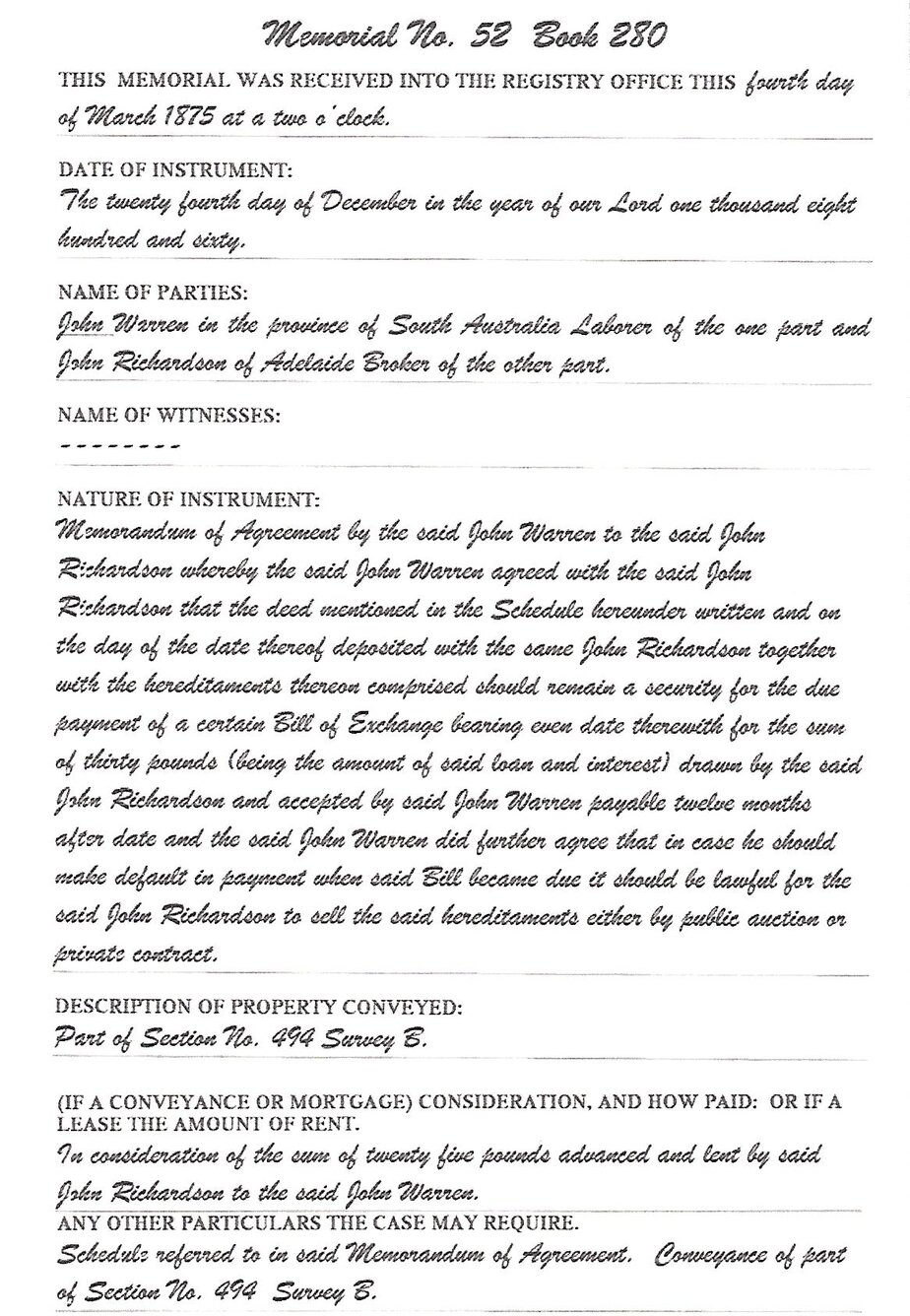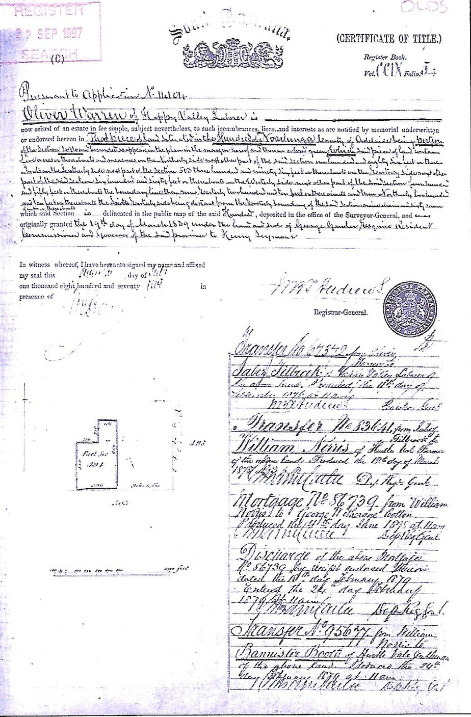 Now that Mary was re-married and living with her second husband, Thomas Hales, it is most likely that Oliver brought his bride, Elizabeth to live in the house that his father, John Warren, had built on the land at Happy Valley.By 1875, Oliver Warren had defaulted in repayment of the Bill of Exchange over the Happy Valley land and John Richardson enacted his right to sell the land. He contracted with Oliver to sell the land to Oliver for the sum of £25.