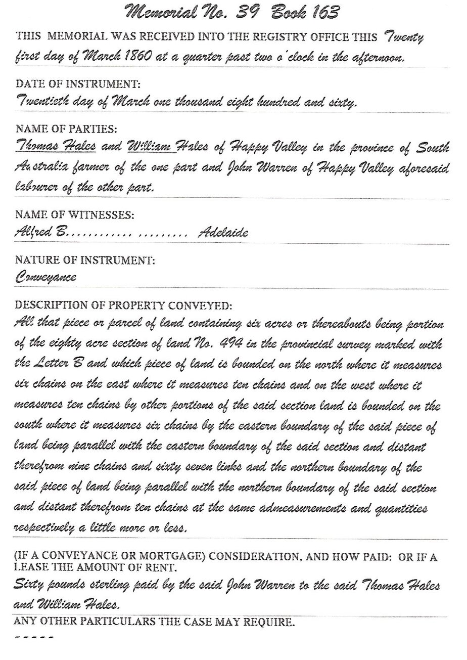 It is not clear what the sale price of the Happy Valley land was when Oliver sold it to Tabez Tilbrook. The details of the changes in titles of the Happy Valley land are –