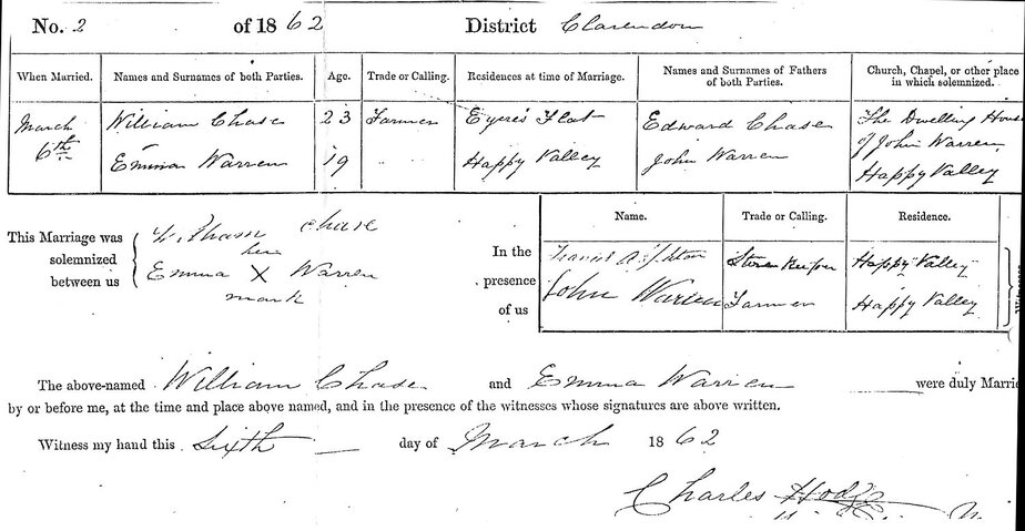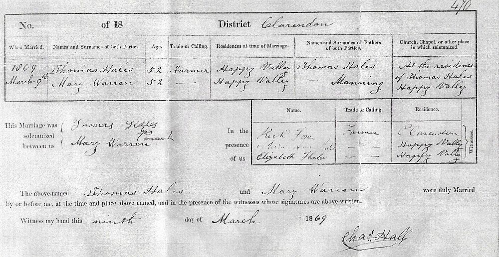 Thomas described himself as a farmer of Happy Valley and he named his father as Thomas Hales. Thomas was literate and signed the marriage certificate whereas Mary Warren signed with a cross. One of the witnesses to the marriage was Thomas’ daughter, Elizabeth Hales.
