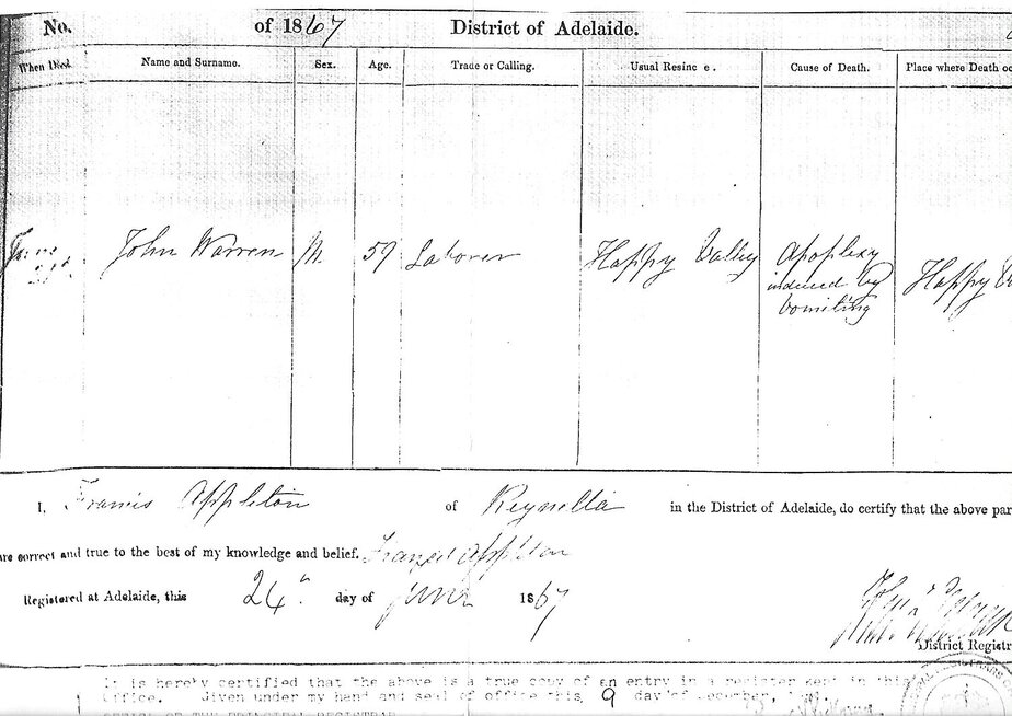 On October 7, 1875, Mary’s second husband, Thomas Hales, died at Happy Valley. The newspaper The South Australian Register of November 6, 1875, reported that he died after a lingering illness. He was buried in the original Happy Valley Cemetery, not far from John Warren.