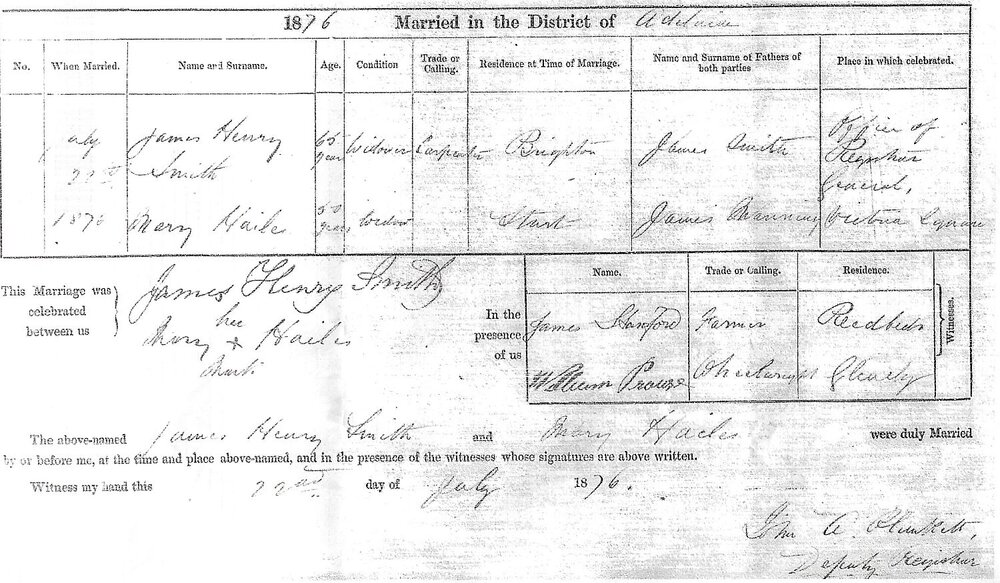 Mary (nee Manning, aka Mary Warren, aka Mary Hales) a widow after the death of her second husband, married again on July 22, 1876. She married James Henry Smith at a service held in the Adelaide Registry Office. Mary, this time as Mary Hales, was 60 years old and a widow and her new husband, 65, was a widower. James was a carpenter living in Brighton – his father was given as James Smith. Mary was described as a widow living in Sturt. James signed the marriage certificate with a strong well-formed signature. Mary signed with a cross. Mary identified herself as ‘our Mary’ by providing her father’s name – James Manning.