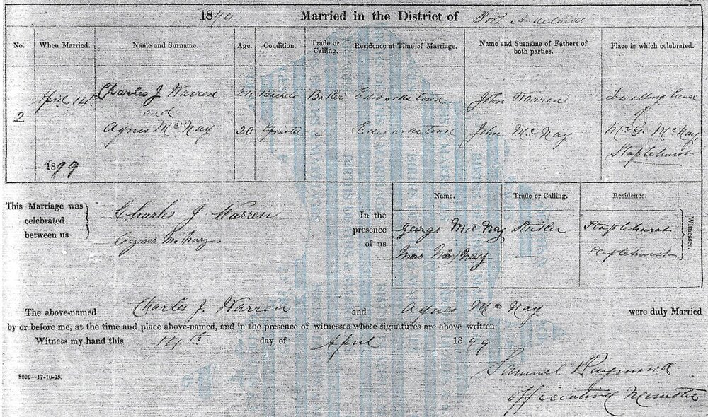 1879 – Marriage - Charles James Warren to Agnes McNay