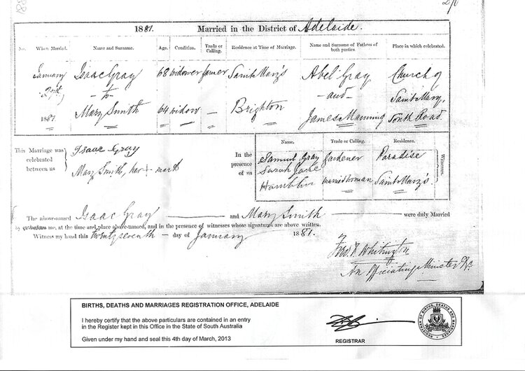 The marriage certificate gives their ages as Isaac 68 years and Mary 64. Isaac was a farmer. His father was Abel Gray. Mary Smith (our Mary) was living at Brighton where she had lived with her last husband, James Henry Smith.