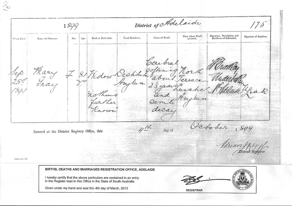 1899 Death Certificate - Mary Gray at Destitute Asylum, Adelaide, SA