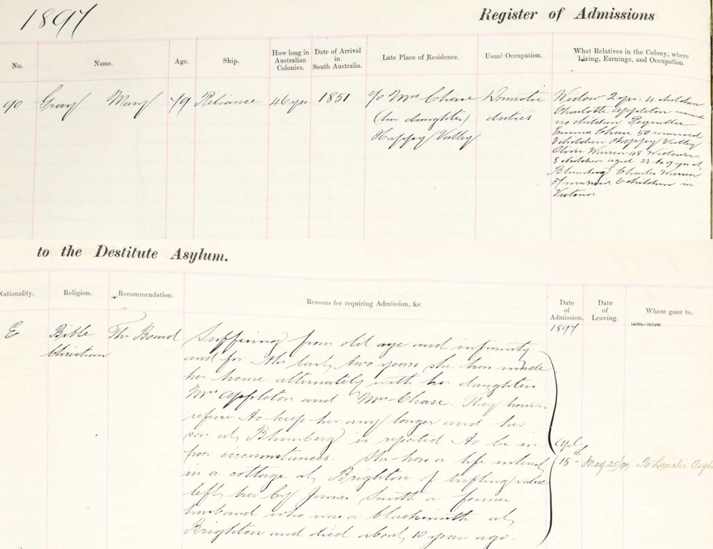 Mary was 76 years old when Isaac died in 1895. By 1897 she had been a widow for 2 years and in that period, had lived alternatively with her daughters Emma (Mrs. Chase) and Charlotte (Mrs. Appleton). On April 15, her daughter, Emma Chase, with whom she had been lately living, applied to have her admitted to the Destitute Asylum in Adelaide. In response to the question about her relatives, Emma answered –